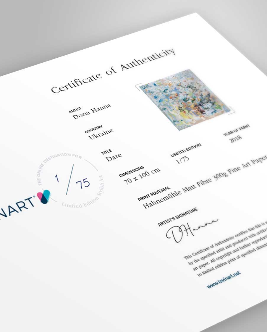 Limitli edisyonlu bir sanat eseri, sanatçı imzası ve hangi adetli edisyonun kaçıncı kopyası olduğu üzerinde belirtilen 'Orijinallik Sertifikası' ile birlikte sanat alıcısına gönderilir. Ayrıca, hangi teknikle ve kalitede üretildiği, kullanılan fine art kağıdı dahil tüm baskı özellikleri sertifika üzerinde yer alır.