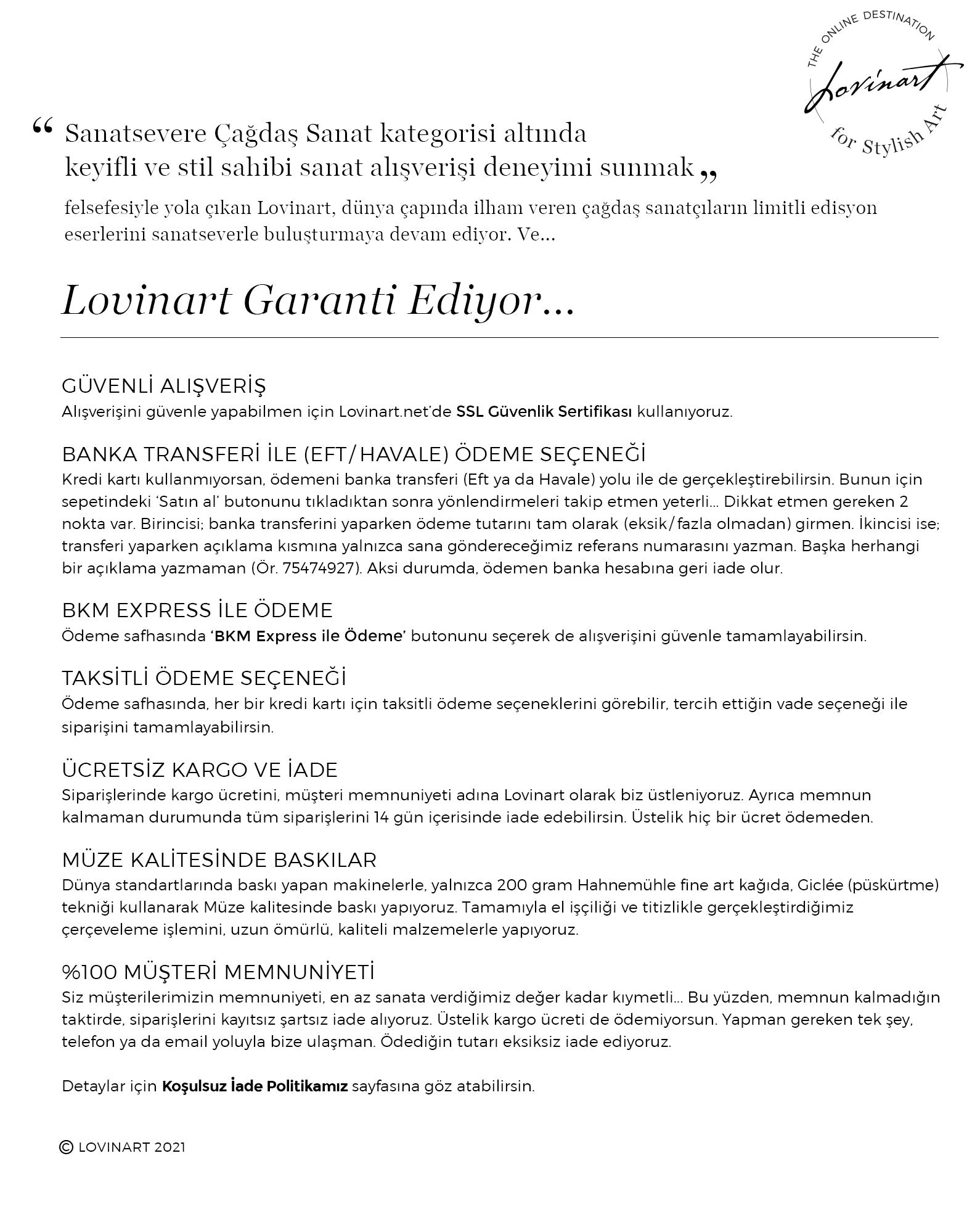 Limitli edisyonlu sanat eseri bu taahhüt doğrultusunda, sanatçı imzası ve hangi adetli edisyonun kaçıncı kopyası olduğu üzerinde belirtilen 'Orijinallik Sertifikası' ile birlikte alıcıya gönderilir. Ayrıca, hangi teknikle ve kalitede üretildiği, kullanılan fine art kağıdı dahil tüm baskı özellikleri sertifika üzerinde yer alır.
